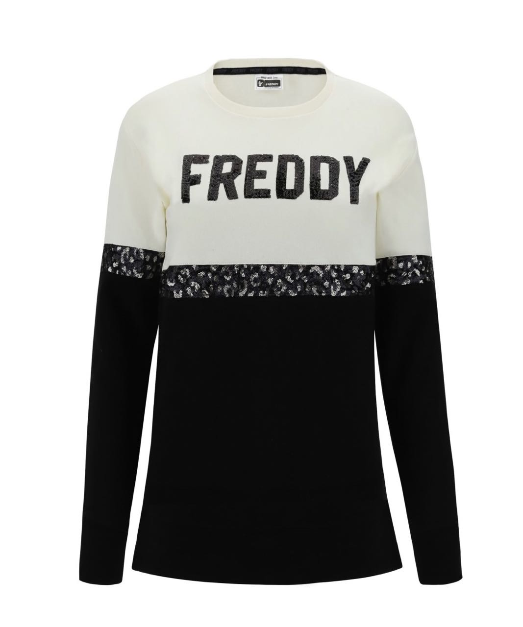FREDDYロゴとスパンコールパネルを備えたツートンカラーのコンフォートフィットスウェットシャツ。クルーネック、わずかにフレアの裾、手首に袖口のある長袖。