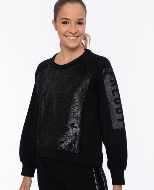 前面にマキシスパンコールインサートで装飾されたクロップドカットスウェットシャツ、輪郭にキラキラFREDDYロゴ、トーンオントーンブラック。