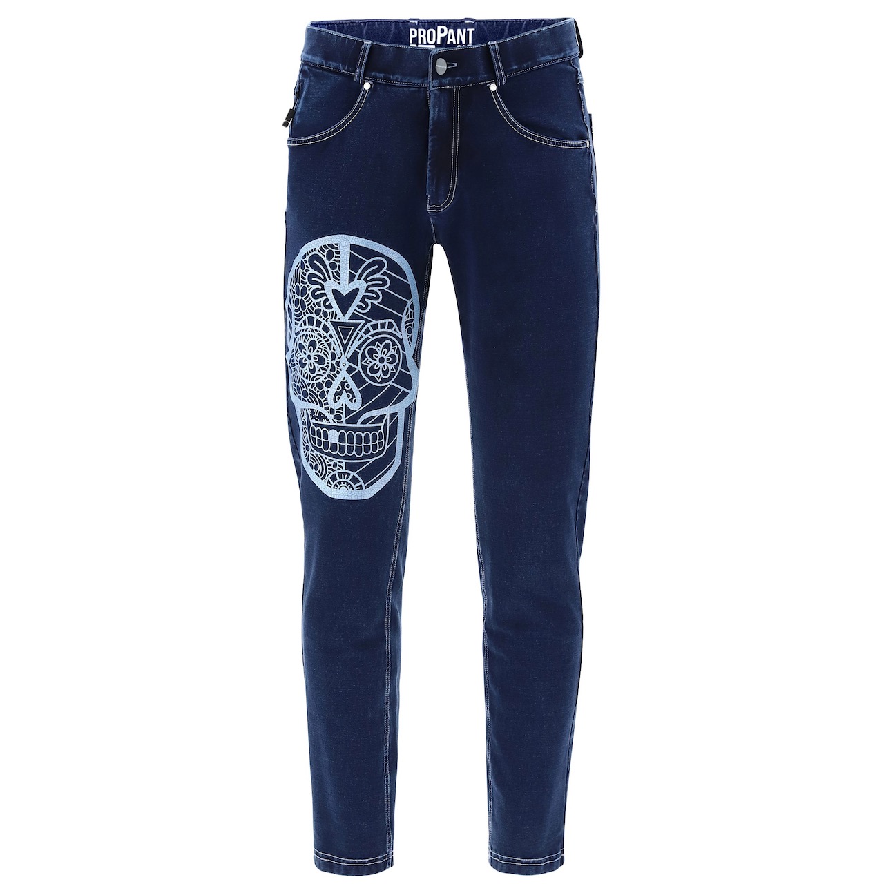 キュービズム、ストリートアート、ポップアートをエネルギーとポジティブさにあふれた作品と組み合わせた多面的なアーティスト、ロメロブリットによる、デニム効果のあるストレッチジャージーパンツ左上脚に大きな白いドクロが飾られています。