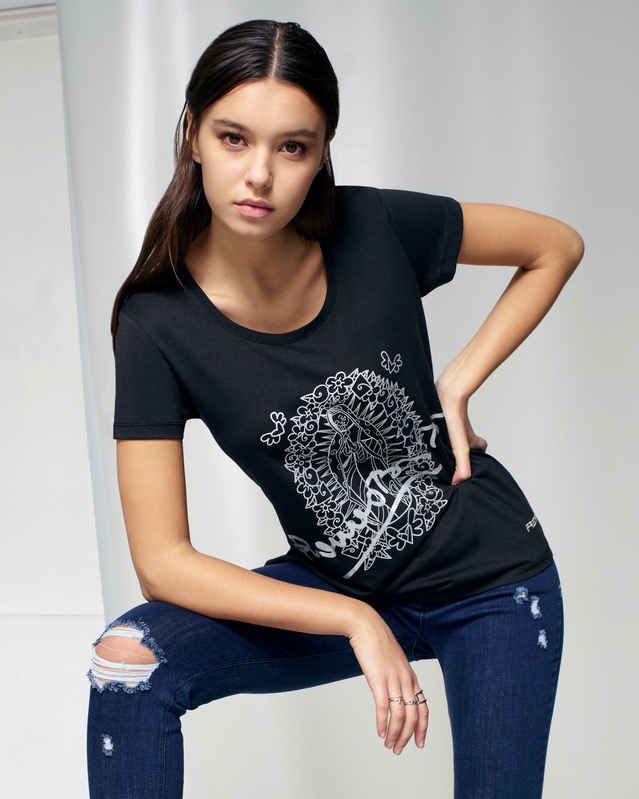 グアダルーペのマドンナを描いたマキシシルバーで飾られたモーダルジャージーTシャツ。 モデルは、広いクルーネックライン、短い袖、わずかにフィットしたデザイン、そしてレギュラーフィットを特徴としています。 ボトムのFREDDYとバックのネックラインの下にあるロメロブリットのシグネチャーがスタイルのディテールを完成させています。